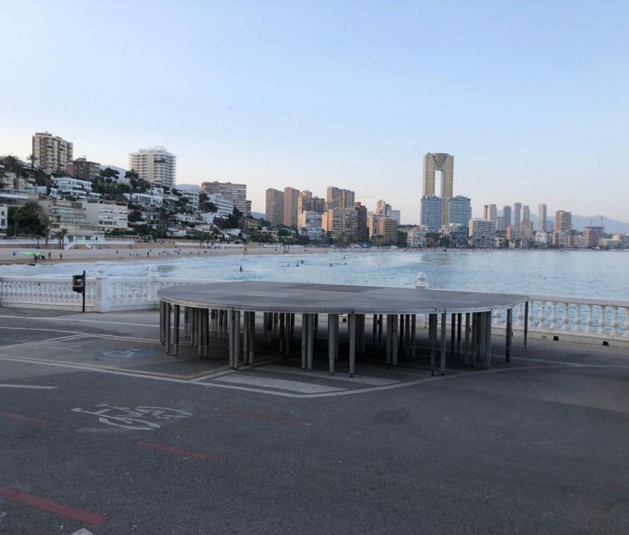Eine halbrunde Bühne mit wundervollem Ausblick auf den Strand von Benidorm in Spanien.