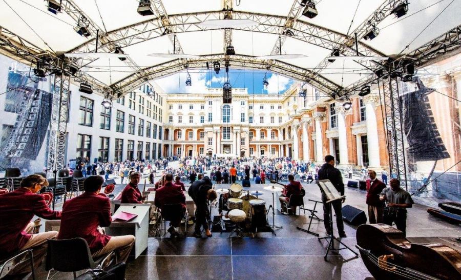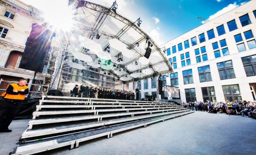 Dieser imposante Aufbau mit unseren Bühnenpodesten wurde durch die Firma L&S GmbH & Co. KG im Humboldt Forum in Berlin realisiert.