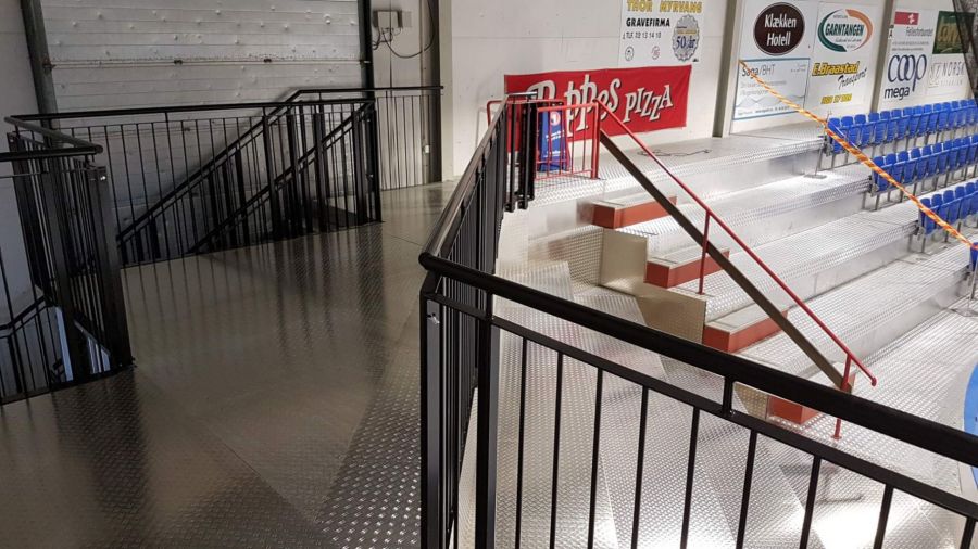 Die Tribüne steht jetzt in der Schjongshallen in Hønefoss, Norwegen.