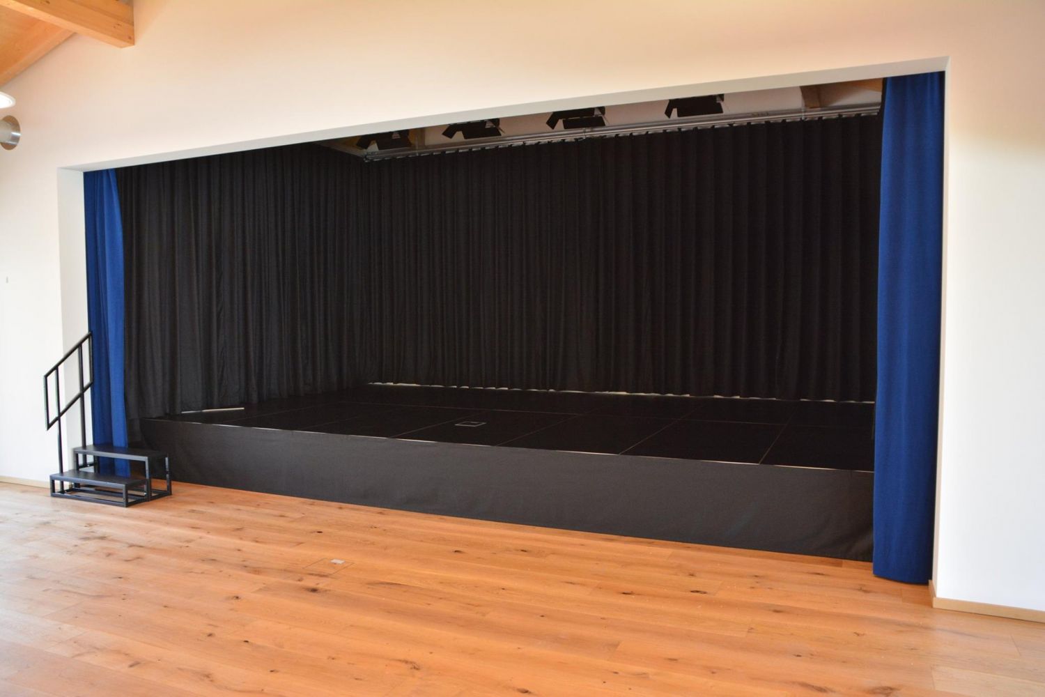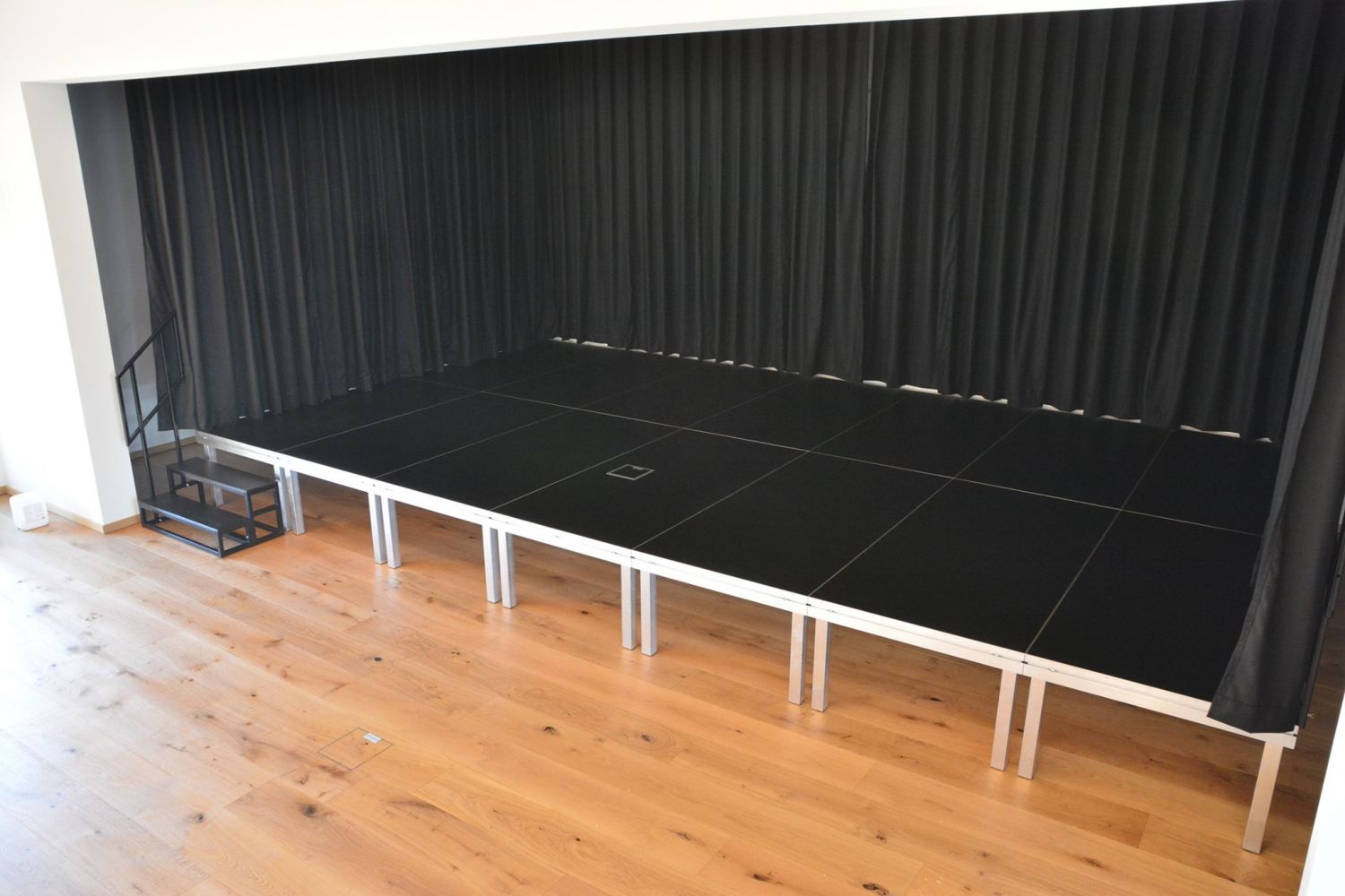 Das zeigen diese Bilder von einer frisch gelieferten Bühne für einen Pfarrsaal inklusive Verblendung und Vorhang.
