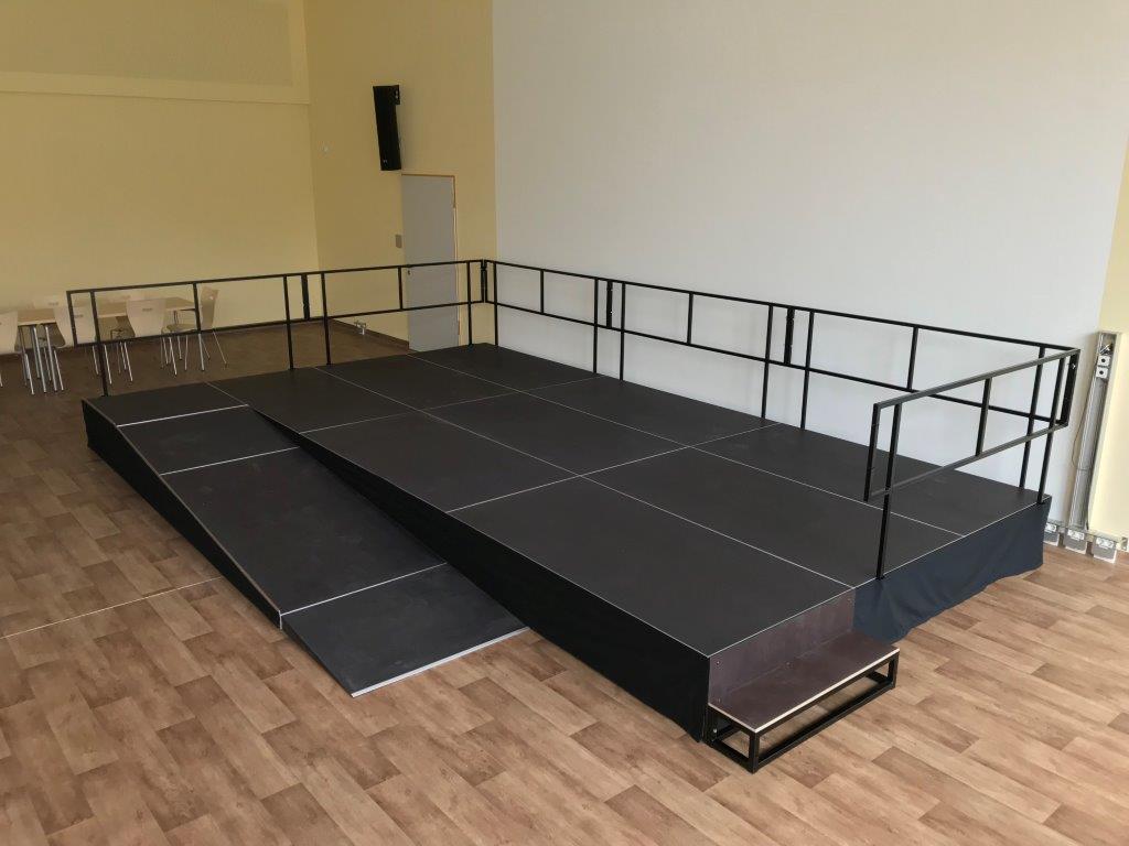 Diese Bühne mit Rampe wurde vor wenigen Tagen geliefert und aufgebaut. Das Besondere: Die Verblendung wurde an die Schräge der Rampe angepasst.